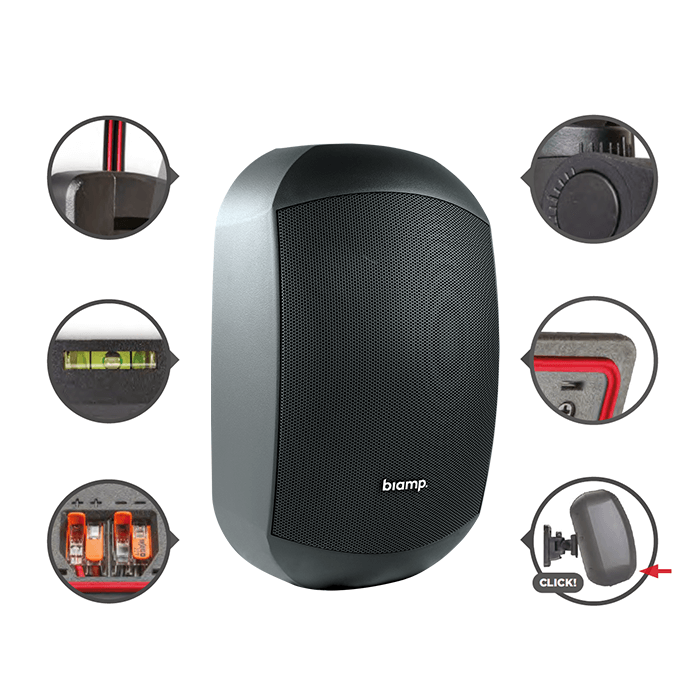 Gracias al revolucionario diseño del soporte ClickMount, el MASK6C es sin duda el altavoz más rápido y fácil de instalar hasta la fecha. Los clics predefinidos en el ClickMount aseguran una alineación perfecta para cada altavoz. Con el sistema discreto de gestión de cables, el nivel de burbuja integrado y los conectores de entrada/salida, el cableado completo se realiza en el soporte. Para completar la instalación, simplemente haga clic en el altavoz del ClickMount!